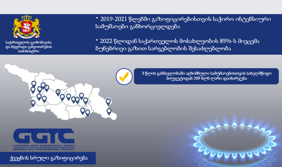 შპს “საქართველოს გაზის ტრანსპორტირების კომპანია”, საქართველოს მთავრობის განკარგულებების საფუძველზე, მოსახლეობის გაზმომარაგების მიზნით, სამშენებლო სამუშაოებს სისტემატურად ახორციელებს. სამწლიანი გეგმის ფარგლებში, 2019-2021 წლებში, ქვეყნის გაზიფიცირებისთვის საჭირო სამუშაოები დასრულდება. რის შემდეგაც, 2022 წლისთვის საქართველოს მოსახლეობის 85%-ს ექნება ბუნებრივი გაზით სარგებლობის შესაძლებლობა. აღნიშნული სამუშაოებისათვის სახელმწიფო ბიუჯეტიდან 209 მილიონი ლარი დაიხარჯება.